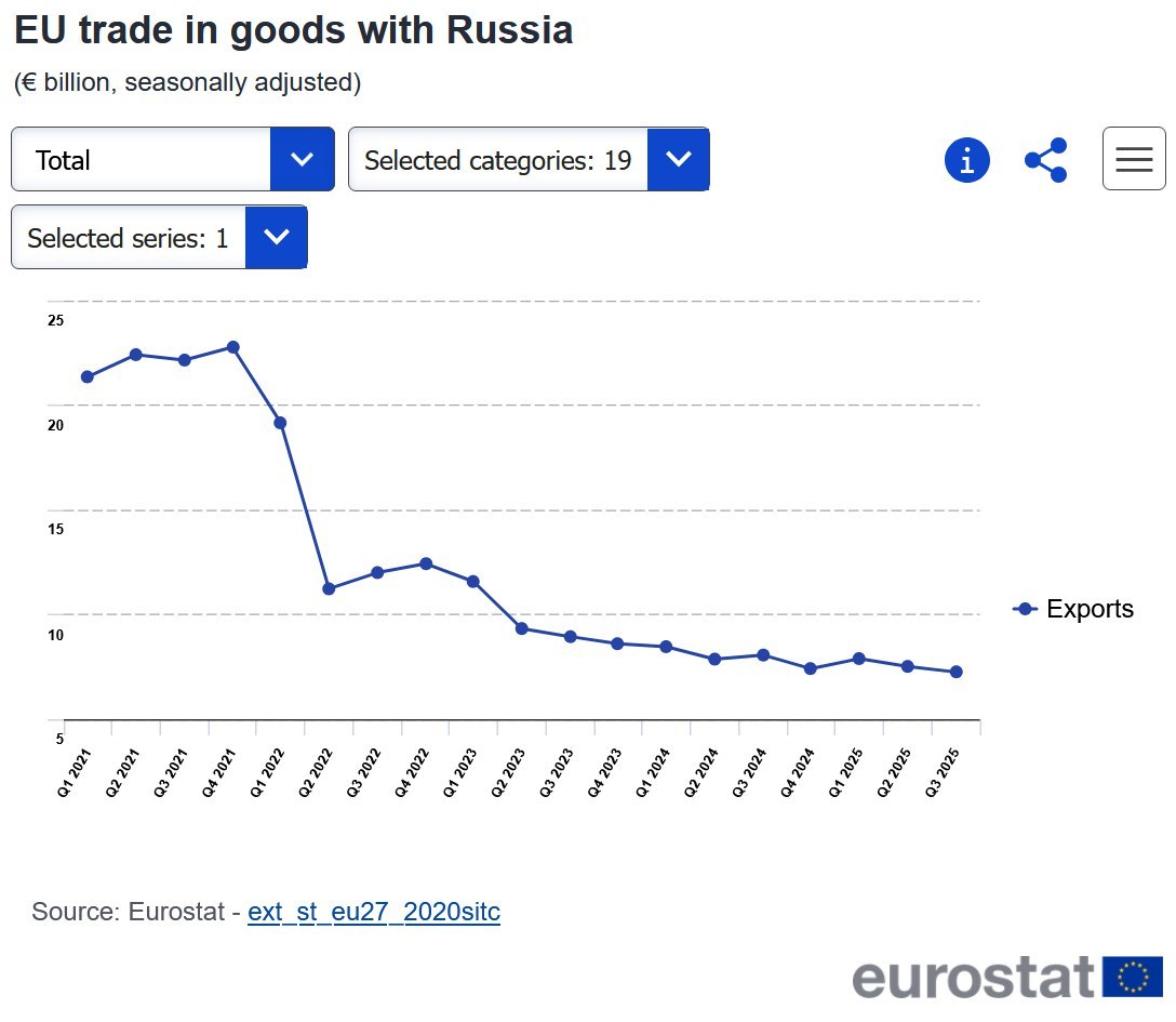 The EU made €25 billion ($27 billion) from exports to Russia between January and October of 2025, compared to €73 billion for the same period in 2021, data from the EU statistics office shows.