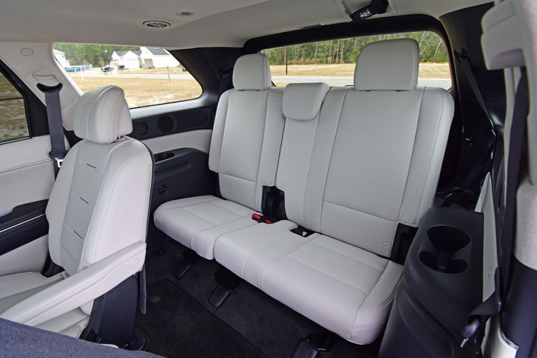 The seating areas are comfy and very accommodating, as you have power adjustments in the Palisade Calligraphy trim. Such power adjustments are quite helpful, and the second row adjustments, as confusing as they are for supposedly moving the seats out of the way for third-row access, move quickly out of the way at the press of one button. Though that walk-in movement is somewhat tricky as there’s not as much space to sliver through to the third row, which may be an attribute to allowing you to keep a LATCH-equipped child seat in place during the forward-fold process.